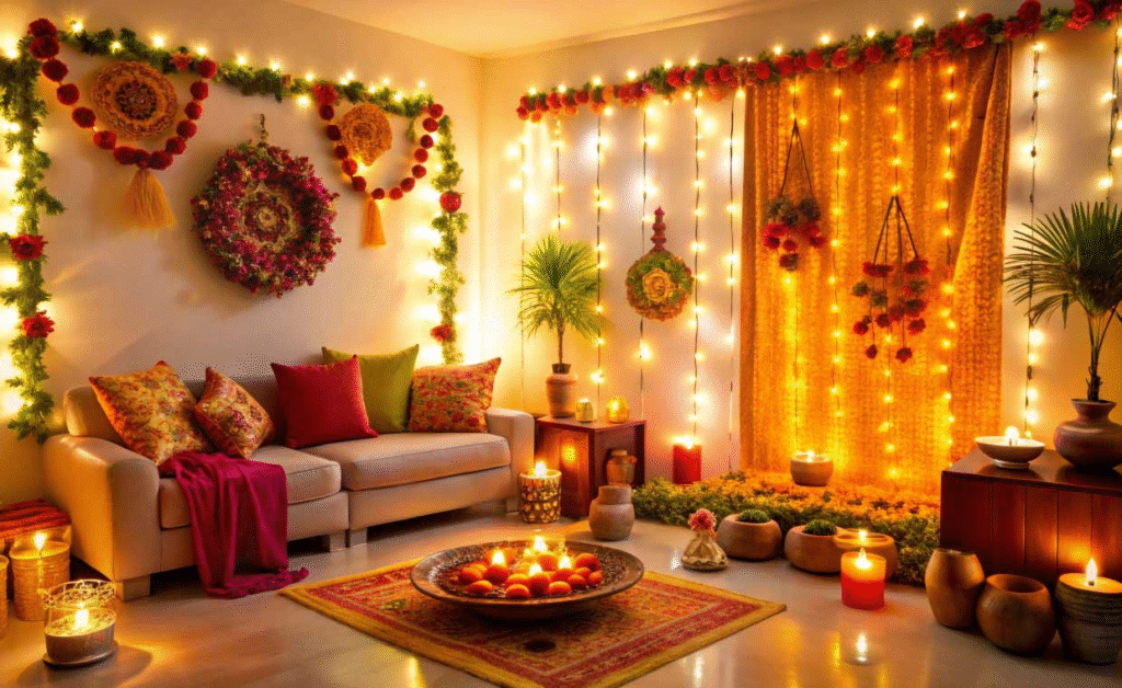 Nothing sets the mood like twinkling lights. Instead of splurging, use fairy lights, candles, or LED tea lights to create that golden holiday glow. Try wrapping string lights around mirrors, stair railings, or empty wine bottles for a magical touch.